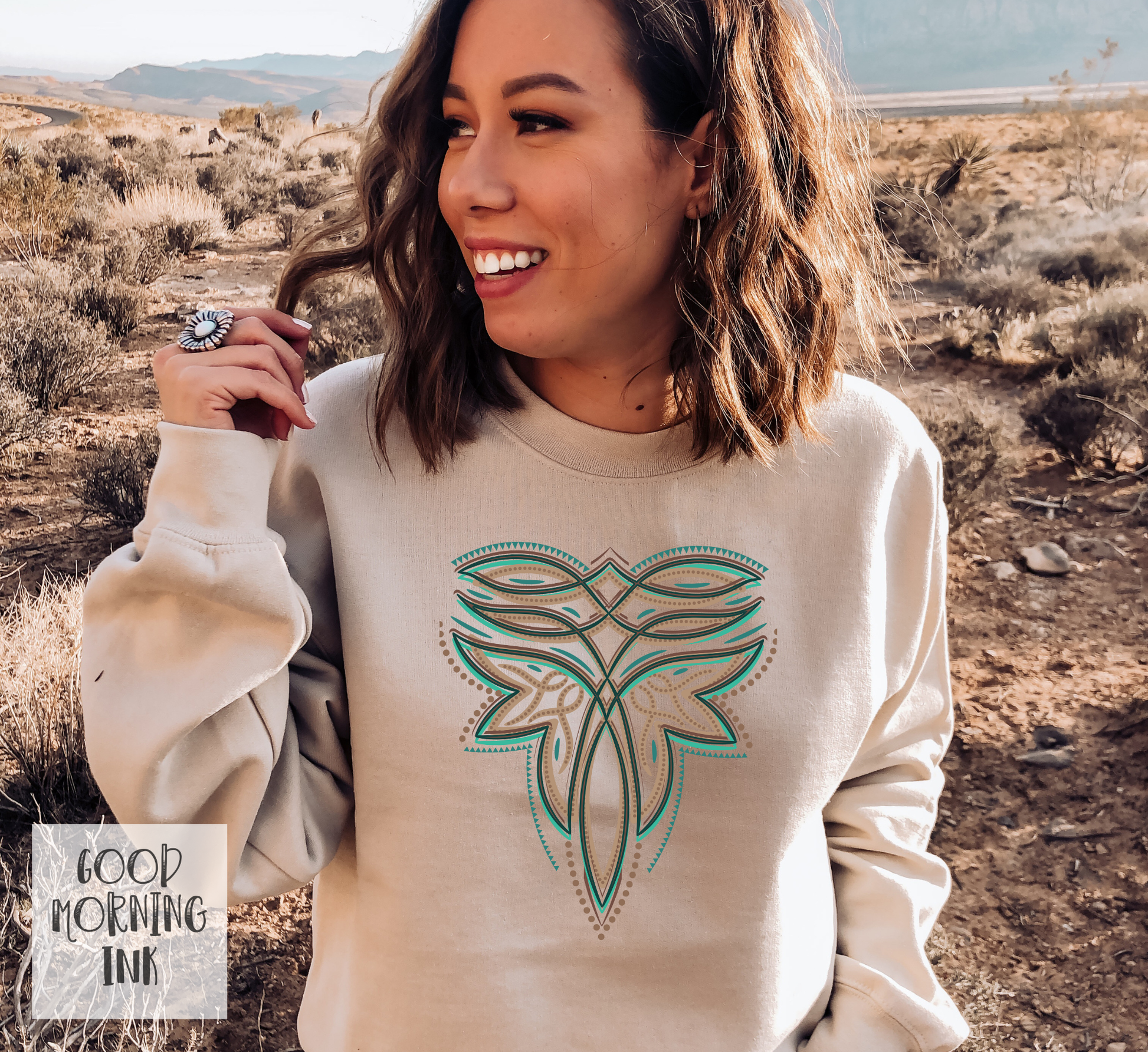 This GORGEOUS turquoise and brown Boot Stitch western graphic crewneck sweatshirt is an absolute MUST HAVE!