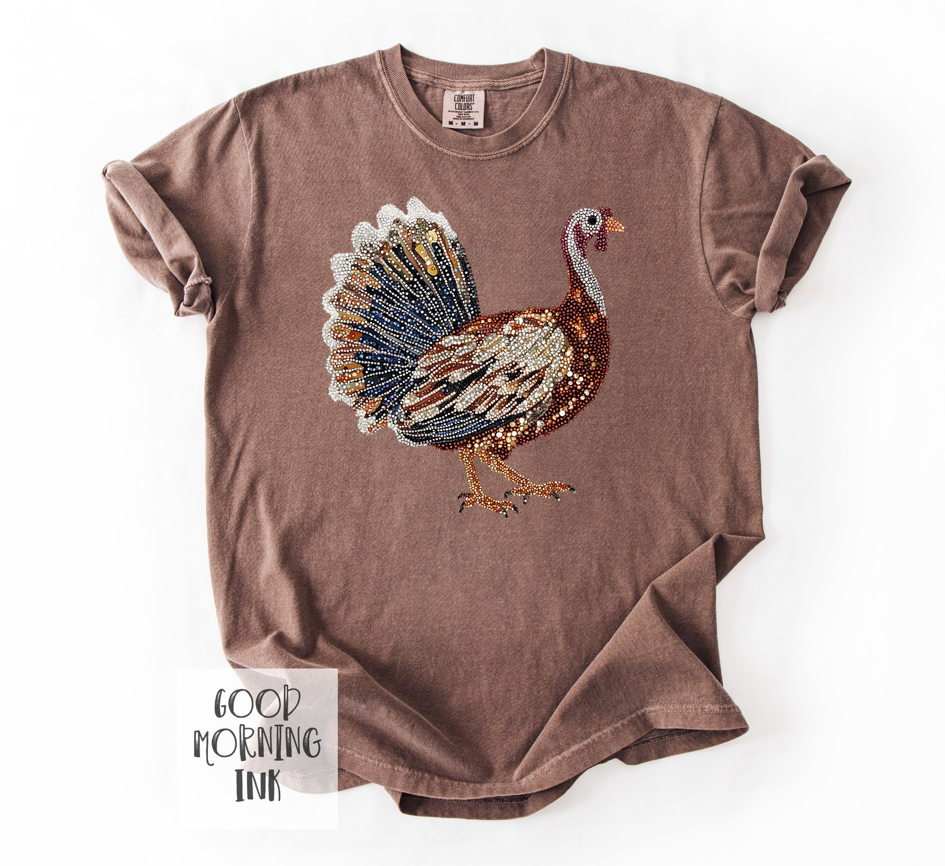 Celebrate the season in style with this charming Faux Rhinestone Graphic Turkey on the very popular Comfort Colors brand tees....
